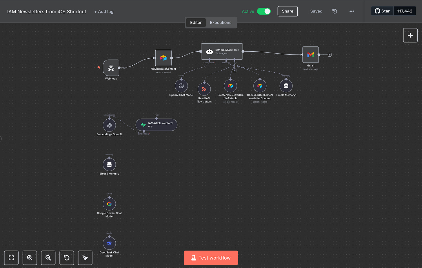 None of this started with multiple LLMs, vector lookups, or a dozen checks. The IAM newsletter workflow began embarrassingly simple: a webhook that took text from my phone and dropped it into Airtable. That was it.
