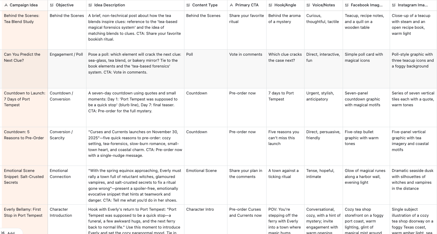 Campaign idea– short title (single line text)Objective– long text (what this post is trying to do: social proof, fomo, connection, etc.)Idea description– long text (detailed concept)Content type– long text (quote graphic, behind-the-scenes video, trope tease, poll, etc.)Primary CTA– long text (how you ask the reader to act, in your voice)Hook / angle– long text (the scroll-stopping first line or framing)Voice notes– long text (this is about tone of this piece, not audio dictation)Image guidance– long text (visual direction for cover, AI art, or designer)Status– single select with options like:Starting point