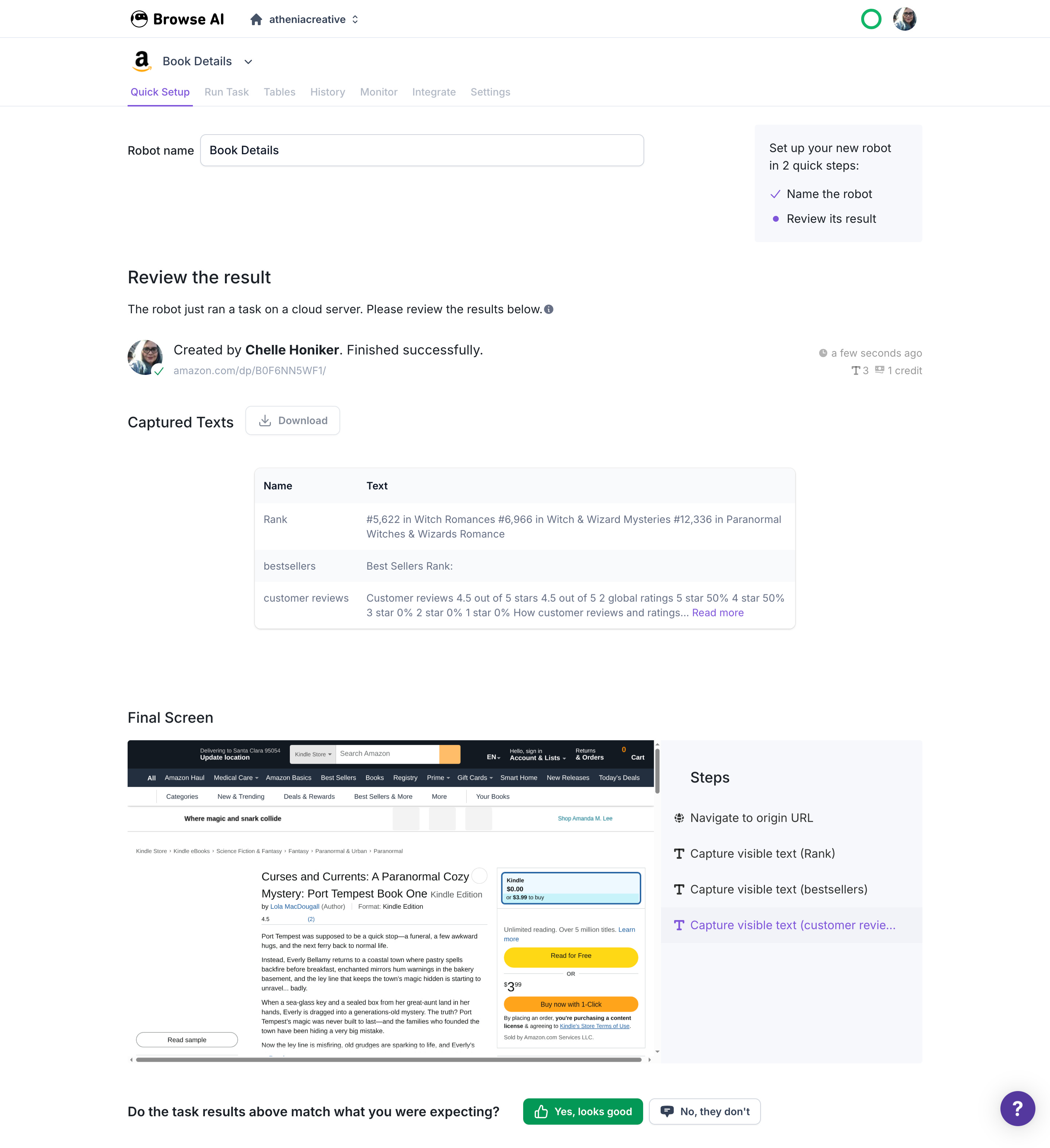 Check that everything looks right. The robot shows you the “Final Screen”—a screenshot of your book page with the steps it took listed on the side: Navigate to origin URL, Capture visible text (Rank), Capture visible text (bestsellers), Capture visible text (customer reviews).